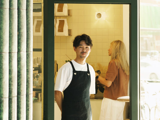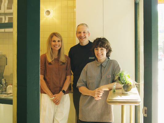 For the shop design, we partnered with Sarah Trotter of AOA Christopher Peck, who worked to honour the architectural significance of the building in giving the shop space new life. Soft, buttery colours, curved forms, brass fixtures, and a feature light from Volker Haug & Flack Studio create a cosy, warm and luminous cafe space that almost glows when seen from the street.